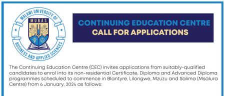The Continuing Education Centre (CEC) invites applications from suitably-qualified candidates to enrol into its non-residential Certificate, Diploma and Advanced Diploma programmes scheduled to commence in Blantyre, Lilongwe, Mzuzu and Salima (Msalura Centre) from 6 January, 2024.