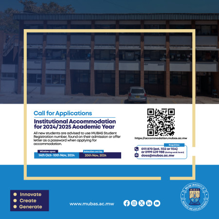 The Malawi University of Business and Applied Sciences (MUBAS) would like to inform all its students, including newly selected students that the application window for campus and off-campus accommodation is now open. The application window runs from 14th October to 10th November, 2024. Applicants will receive notifications regarding the status of their application by 20th November, 2024. All new students are advised to use MUBAS Student Registration number, found on their admission or offer letter as a password when applying for accommodation.
