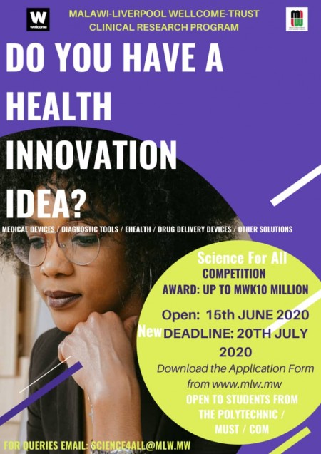 The Malawi-Liverpool Wellcome Trust Science For All (Sci40) initiative is a programme that aims at promoting careers in clinical and biomedical sciences, targeting primary, secondary and tertiary education students. In partnership with the MLW Science Translation team, we are introducing a health innovation competition for tertiary education students. We aim to raise the level of translational science priority and belief, as well as to stimulate students’ passion for health innovation. We are seeking multidisciplinary teams to produce health innovations relevant to Malawi in the form of digital tools or physical products. Once a winning team is identified, they will work together with the MLW Science Translation team and its partners, including the host institution to further the development of the device or product. The award can include expert advice support, project funding support as well as identifying potential key partners or external funding opportunities. The competition is initially open to students from the College of Medicine (CoM), Malawi University of Science and Technology (MUST) and the Malawi Polytechnic, but will be extended to other institutions in future editions.