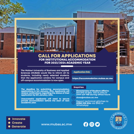 The Malawi University of Business and Applied Sciences (MUBAS) would like to inform all its students, including newly selected students that the application window for campus and off-campus accommodation is now open.
