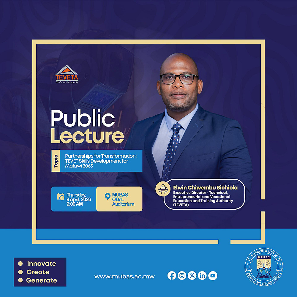 The Malawi University of Business and Applied Sciences (MUBAS) through the Department of Applied Education, in collaboration with Technical, Entrepreneurial and Vocational Education and Training Authority (TEVETA) have organized a Public Lecture on 9 April, 2026, which will be delivered by Elwin Chiwembu Sichiola, TEVETA Executive Director.