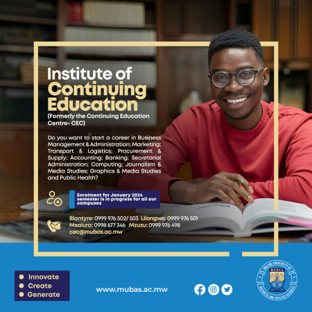 The Institute of Continuing Education (formerly the Continuing Education Centre - CEC) has extended its invitation for applications from suitably qualified candidates to enroll into its non-residential Certificate, Diploma and Advanced Diploma programmes scheduled to commence in Blantyre, Lilongwe, Mzuzu and Salima (Msalura Centre) from 6 January, 2024.