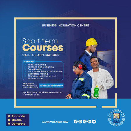 The Malawi University of Business and Applied Sciences (MUBAS), through the Incubation Centre is informing the general public that it will be offering the following courses for the March 2024 intake: