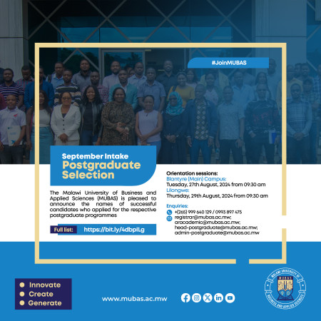 The Malawi University of Business and Applied Sciences (MUBAS) is pleased to announce the names of successful candidates who applied for the respective postgraduate programmes as presented below.