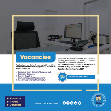 Applications together with copies of relevant qualifications and detailed curriculum vitae with two traceable referees should be sent by Friday, 3rd May, 2024 to vacancies@mubas.ac.mw or The Registrar, MUBAS, P/Bag 303, Chichiri, Blantyre 3. Applicants should indicate the position applied for in the subject line of their emails.