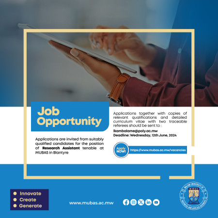 Applications are invited from suitably qualified candidates for the position of Research Assistant tenable at MUBAS in Blantyre.