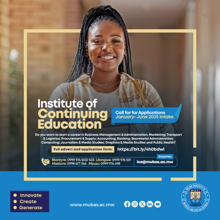 The Institute of Continuing Education (ICE), formerly The Continuing Education Centre (CEC), invites applications from suitably-qualified candidates to enrol into its non-residential Certificate, Diploma and Advanced Diploma programmes scheduled to commence in Blantyre, Lilongwe, Mzuzu and Salima (Msalura Centre) from Monday, 6th January, 2025.